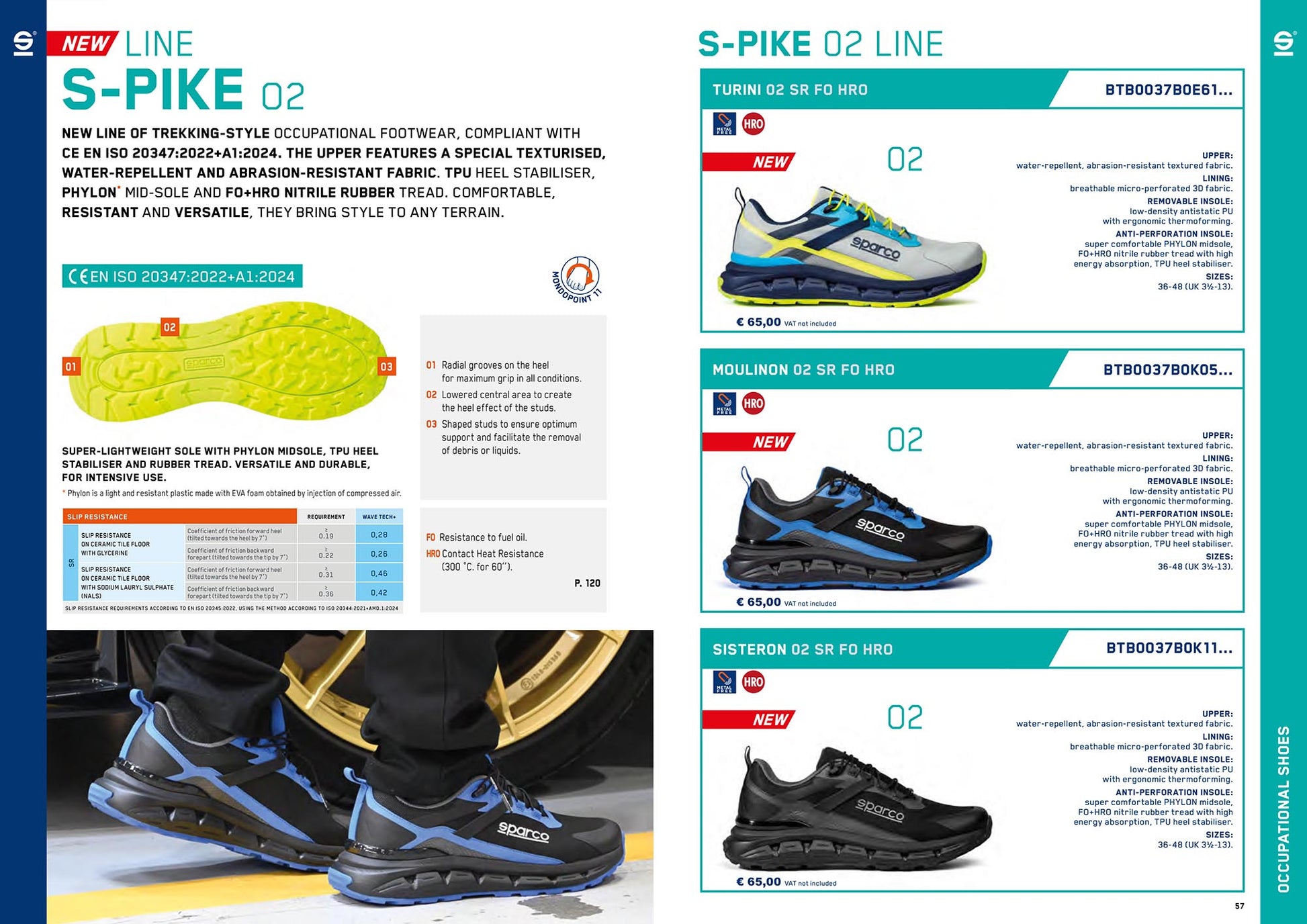 The Sparco S-PIKE 02 Line is a new range of trekking-style occupational footwear designed to deliver comfort, durability, and versatility across demanding environments. Compliant with EN ISO 20347:2022 + A1:2024, these shoes feature a specially texturised, water-repellent and abrasion-resistant upper, a cushioned Phylon midsole, and a high-performance FO + HRO nitrile rubber outsole. A TPU heel stabiliser enhances support, making the S-PIKE 02 Line suitable for intensive use on varied terrain.