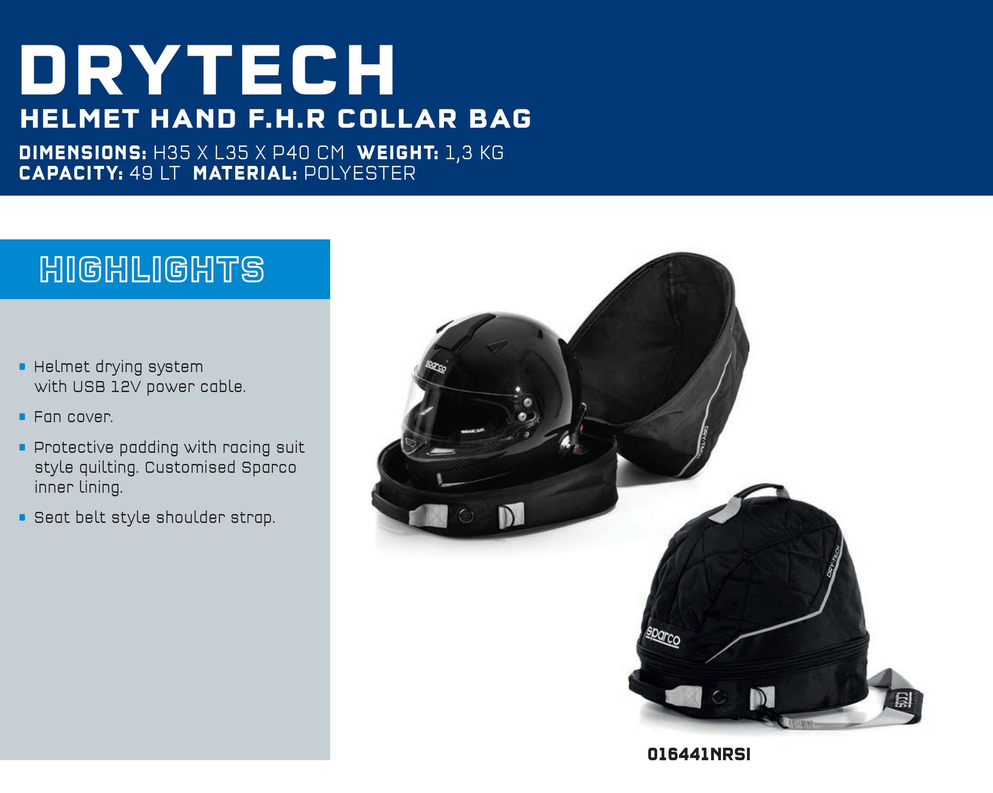 The Sparco Dry-Tech Helmet & FHR Bag / Dryer is unique to Sparco with a clamshell design bag and features a 12v USB built in drying system. This system allows you to dry the inside of your helmet between sessions keeping it in the freshest state possible. With the ability to hold your helmet and FHR device, this is possibly the best FHR holdall on the market today.