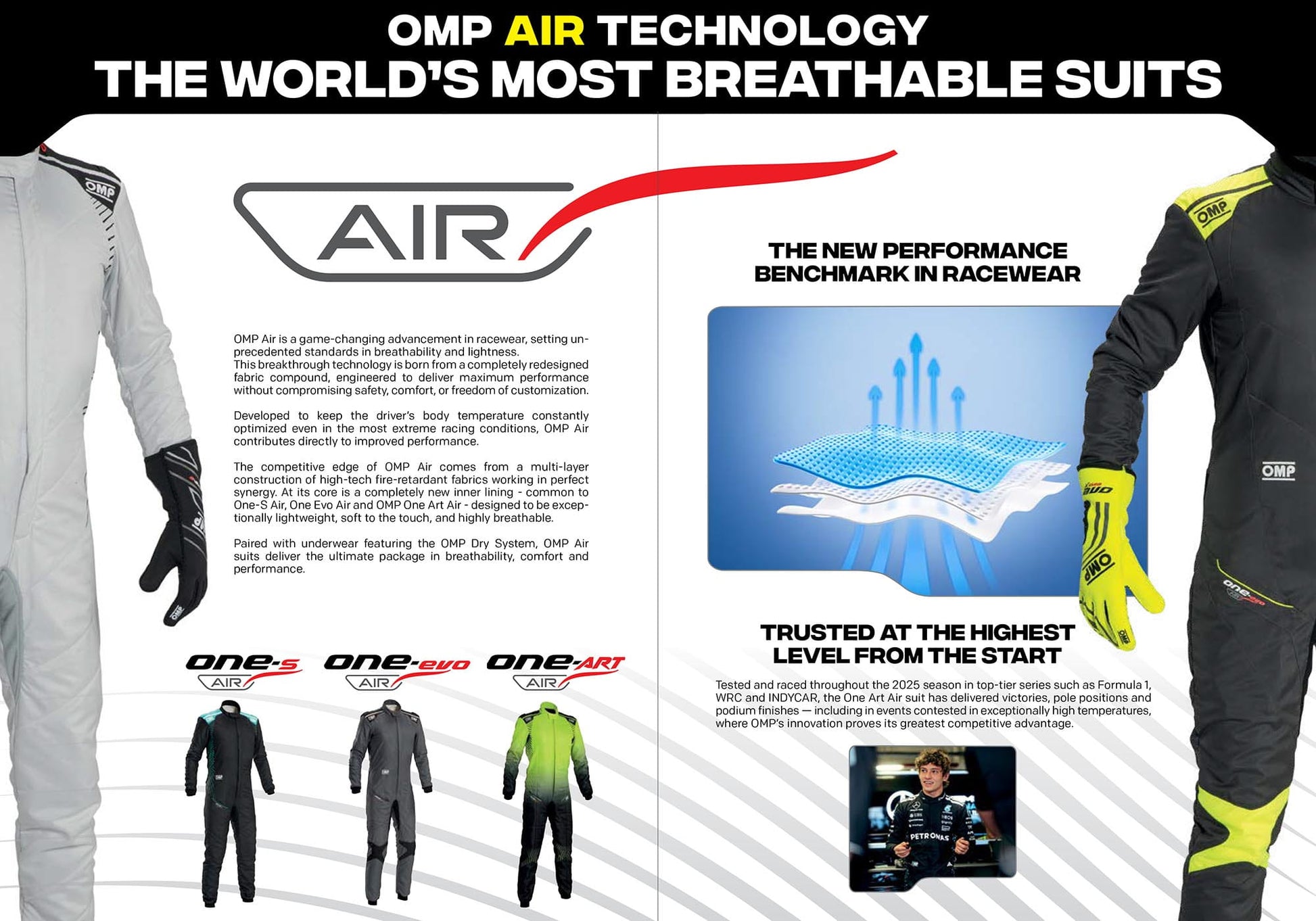 Based on OMP’s revolutionary Air technology, the ONE ART AIR Suit is built for drivers who demand extreme breathability with complete design freedom. Using a wide-weave fire-retardant fabric with a polyester blend, it helps regulate temperature without compromising protection.